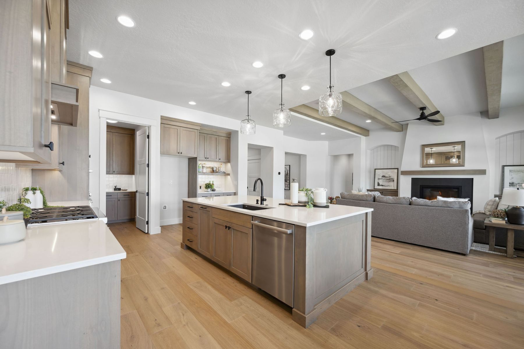 There’s a lot of custom cabinetry in a classic shade of light brown that’s universally appealing, and highlighted by both undercabinet lighting and display cabinetry for a casually elegant backdrop. Generous Quartz countertops, a coffee bar and a walk-in pantry built out with the same level of finishes in the kitchen really sets this kitchen apart from the competition.