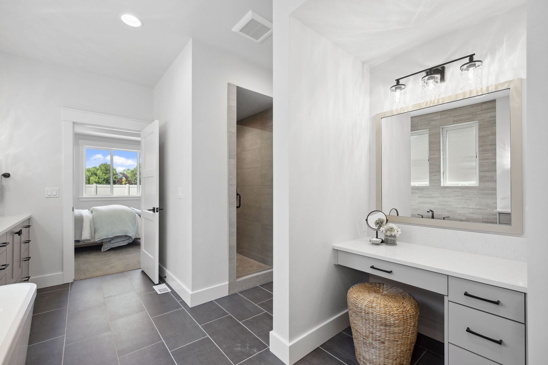 The primary suite is truly a retreat. Spacious, serene, and thoughtfully designed, you’ll love coffered ceiling in the bedroom and the sheer amount of tilework in the bath area. There’s oversized mirrors, designer lighting, two showerheads in the walk-in shower, and a wonderful – and oversized makeup vanity desk and mirror. With ample closet space, it feels more like a boutique hotel than a typical bedroom.